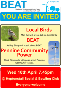 On Wednesday 10 April 2013 Matt Bell will give a talk on local birds, Ashley Sharp will speak about BEAT and Mark Simmonds about Pennine Community Power.This meeting will be at 7.45pm in Heptonstall Social & Bowling Club.