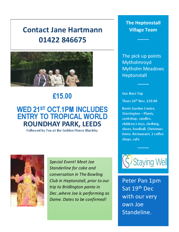The Heptonstall Village Team will be there all day, with fliers and information on the events being arranged for our older generations in Heptonstall and the local community.