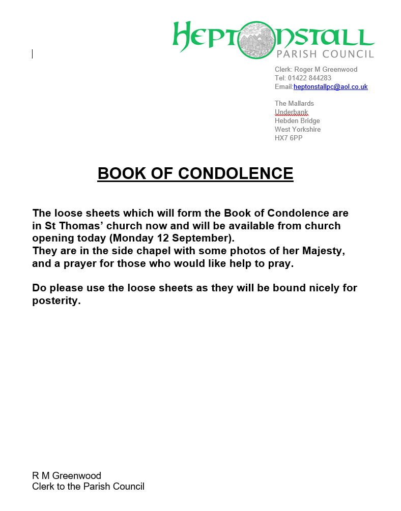 If you need any additional details please contact the Parish Clerk, Hannah Sherriff-Jackson at 1 Denholme Gate Denholme BRADFORD BD13 4EP Tel : 07301 042083 or by email to clerk@heptonstallpc.co.uk.