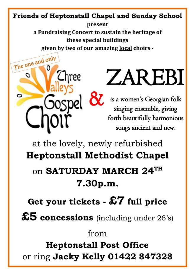 The newly refurbished Heptonstall Methodist Chapel is hosting a concert by two local choirs, the Three Valleys Gospel Choir and Zarebi, on Saturday 24 March.
