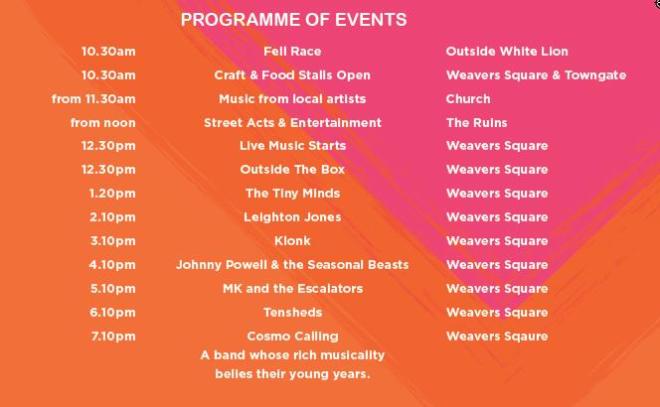 This year’s theme is hearts, from the village with a big heart. Lots of exciting bands, great food stalls and other events. Scroll down for listings of entertainment in the Church, Weavers Square and the Ruins.